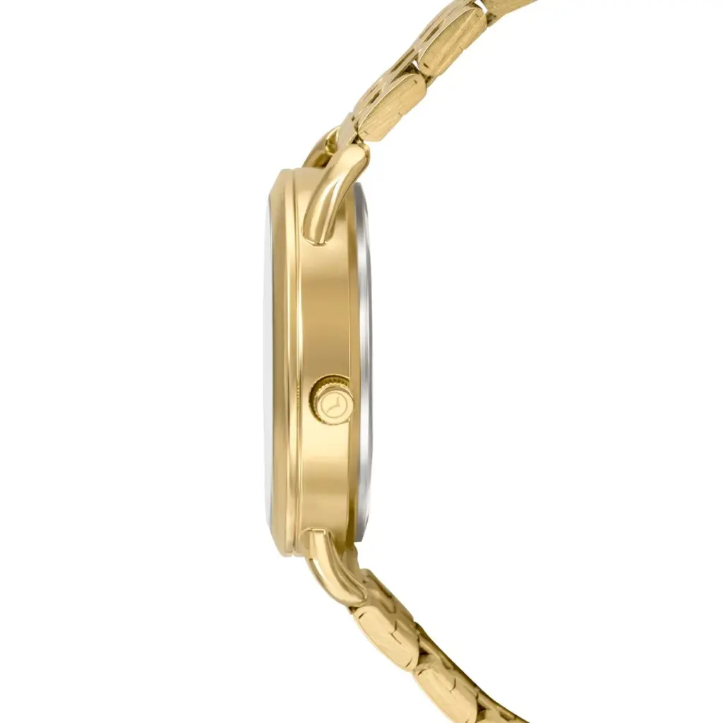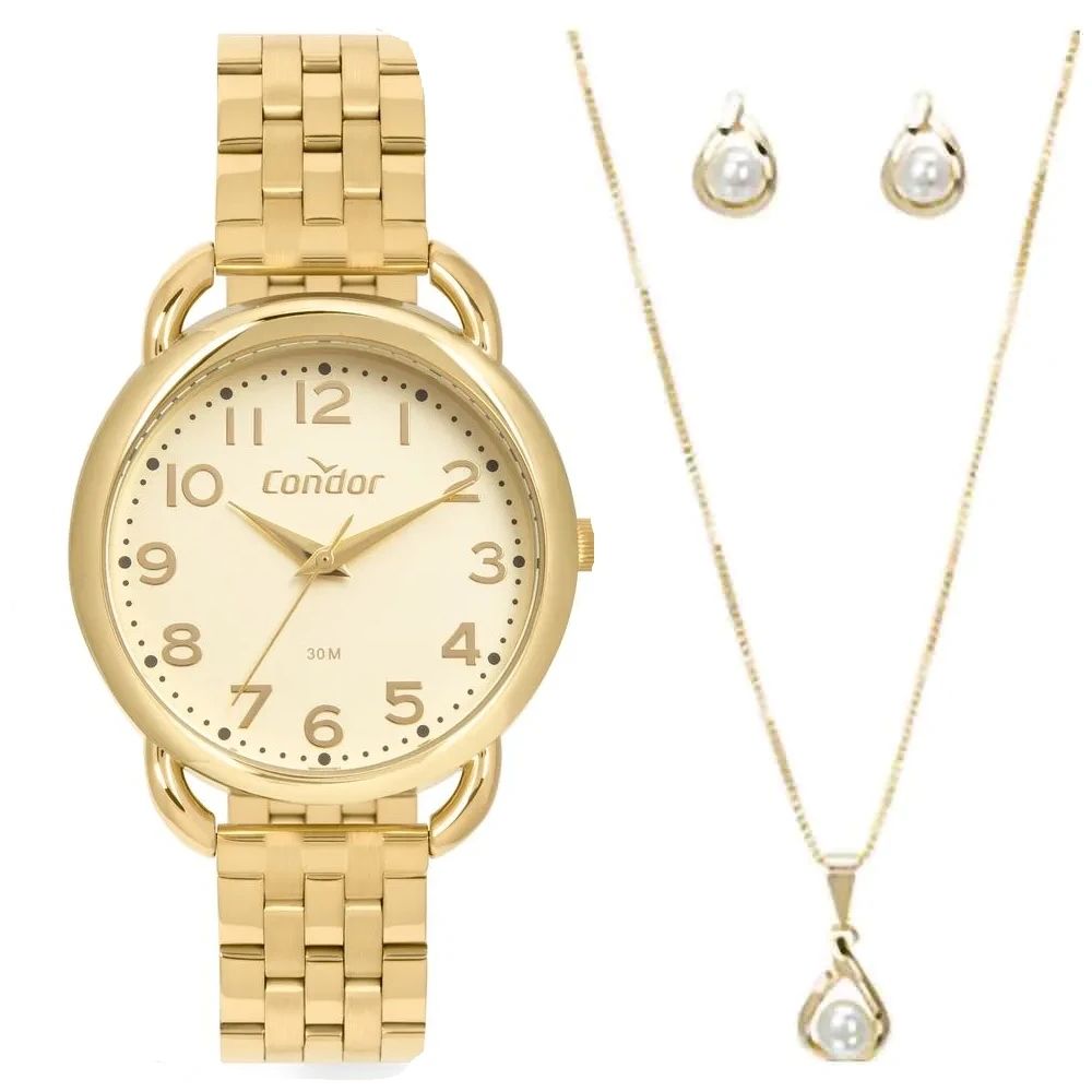 Este elegante kit Condor feminino dourado inclui um relógio analógico clássico com mostrador bege e pulseira de elos. O design versátil se complementa com um delicado colar e brincos em formato de gota, adornados com pérolas, perfeito para adicionar um toque de sofisticação a qualquer look.
