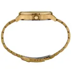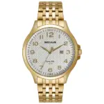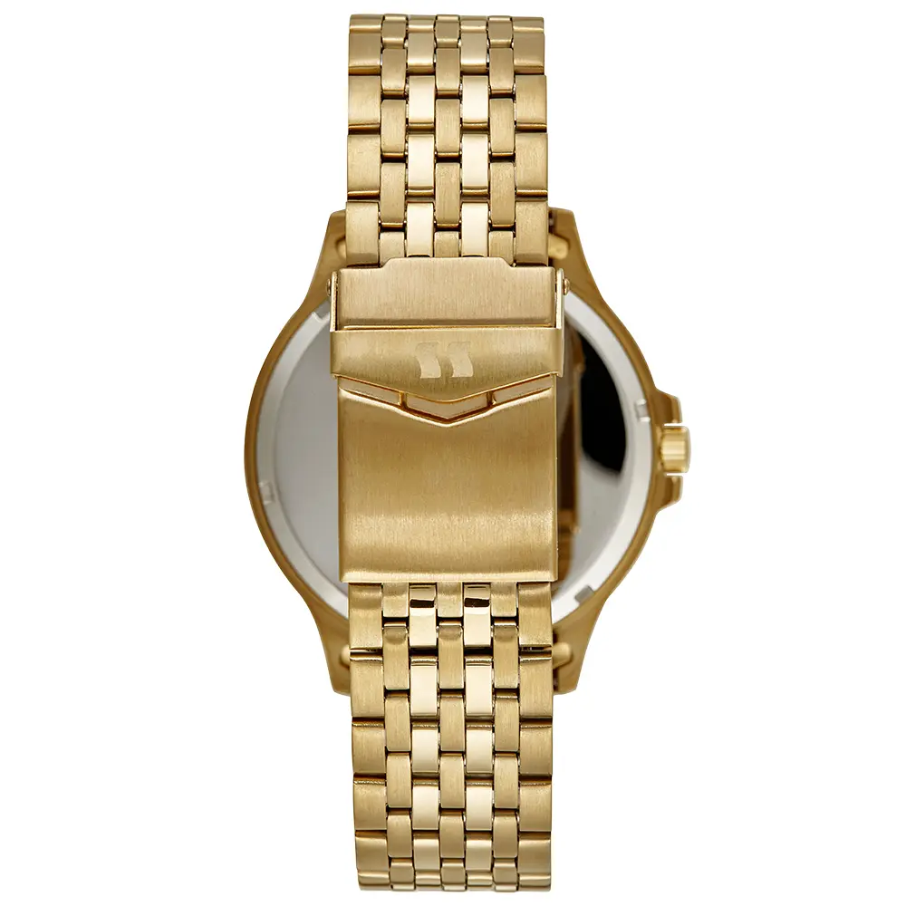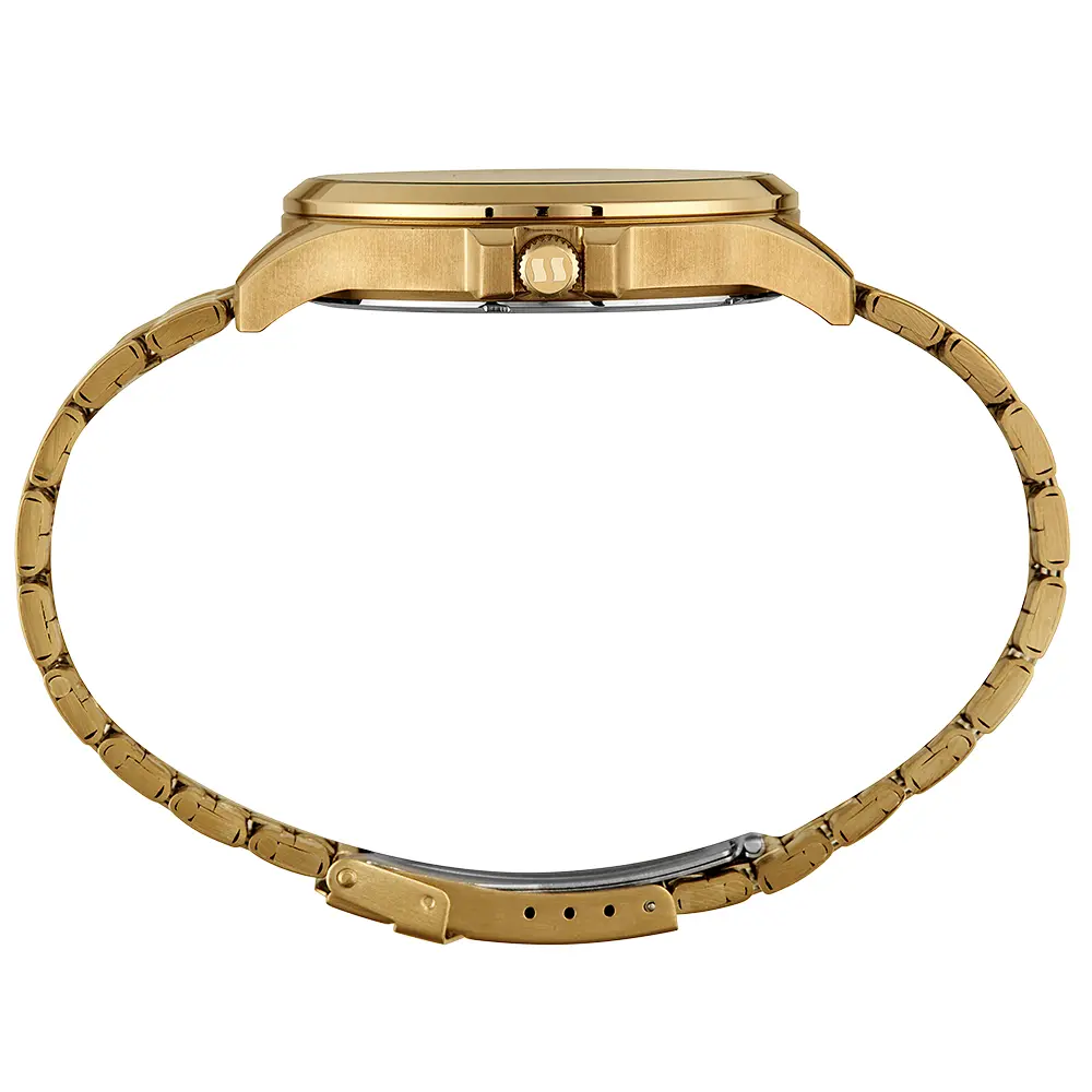 Além de sua estética impecável, o relógio oferece funcionalidade prática com a inclusão de um calendário na posição das 3 horas, permitindo que você esteja sempre atualizado. A pulseira de 22 cm de comprimento e 20 mm de largura é um show à parte, composta por elos em aço dourado que combinam acabamentos escovados e polidos, criando um visual sofisticado e dinâmico. O fecho de trava de segurança proporciona confiança e conforto ao usar o acessório. Com 8 elos removíveis, a pulseira pode ser ajustada para um caimento perfeito.
