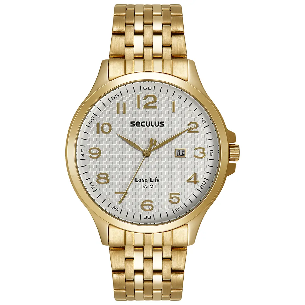 A resistência à água de 5 ATM (50 metros) torna este relógio adequado para o uso diário, resistindo a respingos e banho, mas não é recomendado para mergulho. A linha “Long Life” da Seculus garante uma vida útil prolongada da bateria, reforçando a confiabilidade do produto. Este modelo não possui função de alarme, mantendo sua proposta de elegância e simplicidade. Com uma garantia de 2 anos, o Relógio Seculus em Aço Dourado é a escolha ideal para quem valoriza um acessório versátil, durável e com design refinado.